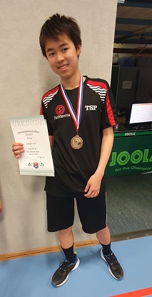Luxuan ging am Sonntag auch noch in der Altersklasse U15 an den Start und hatte auch hier großen Erfolg. Er gewann seine Vorrundengruppe ohne Niederlage und musste in fünf Matches nur einen einzigen Satz abgeben. Nach einem Freilos im Achtelfinale hatte er es eine Runde später mit Lian Bauschke vom Preetzer TSV zu tun, dem er mit einem klaren 3:0 keine Chance ließ. Im Halbfinale war dann jedoch der Vize-Kreismeister Jonas Maack vom TSV Lütjenburg eine Nummer zu groß und wie schon am Vortag hatte Luxuan die Bronzemedaille gewonnen.